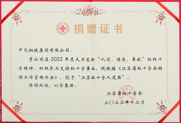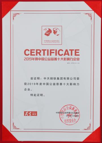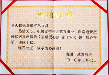 中天钢铁在做大做强企业的同时,始终牢记社会责任,响应习总书记“企业要致富思源、义利兼顾”的要求,热心社会公益和慈善事业。凭借崇高的社会责任感和坚实的慈善贡献,荣获“中国公益慈善十大影响力企业”“江苏慈善奖‘最具爱心慈善捐赠企业’”“常州市红十字人道博爱奖”“常州市慈善事业突出贡献单位”等称号。