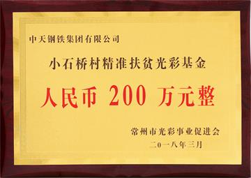 多年来,中天钢铁用于各类社会捐助超12亿元,包括援助汶川地震灾区、西南干旱灾区和玉树地震灾区援助西藏卡嘎镇建设菜籽油加工项目、向贵州从江县捐赠大型机械设备、对口帮扶江苏泗阳大同村等,惠及医疗卫生、教育、体育等十多个领域。